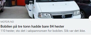 August 2019 kjøpte vi en bobil som vi trodde hadde 110 hester slik det sto i annonsen fra selger (kjent forhandler i Norge). I februar 2020 fikk vi opplysninger som viste seg at bobilen kun har 84 hester. Vi tok da kontakt med forhandler for å heve kjøpet da vi mente vi hadde fått en vare som ikke tilsvarte varen vi hadde kjøpt. Forhandler var ikke villig til dialog og satte umiddelbart advokat på saken. Vi gjorde det samme da forsikringen dekker opptil 100 000,-. Saken gikk til forbrukerrådet feb. 2019. Da det ikke ble enighet der gikk saken videre til forbrukerklagenemda oktober 2019. Der lå saken frem til august 2021, hvor vi da vant frem på alle punkter. Forhandler ble dømt til og ta bilen tilbake. Betale oss kjøpesum på nok 259 000,- + forsinkelsesrenter. Vi trodde nå at 2,5 års langt mareritt var over. Men nei, forhandler anket saken til tingretten. Der var vi i retsmekling fredag 7 januar.
