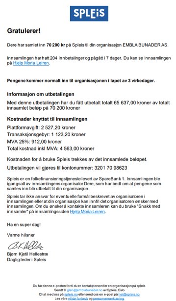 Da har vi fått samlet inn 70.000 på en uke! 40% over målsettingen på halve tiden. Vi avslutter derfor spleisen før tiden sånn at vi kan få sendt pengene der de behøves.