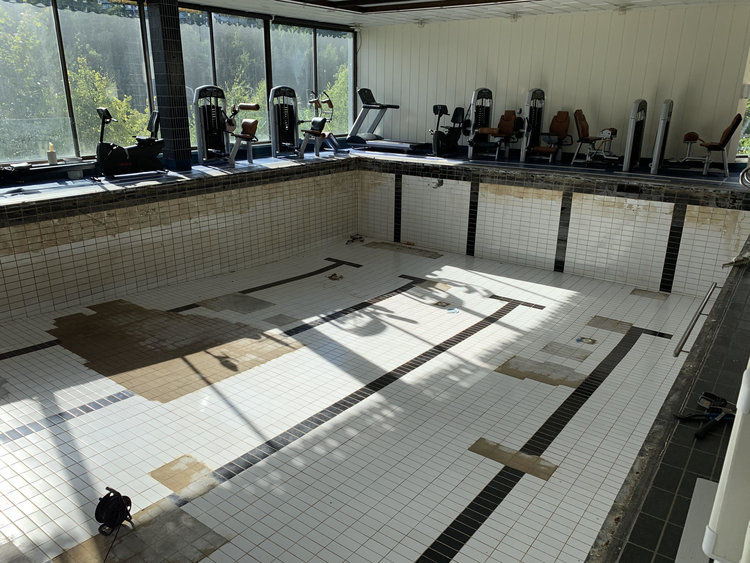 Her er bassengduken fjernet. Det er betydelge skader på fliser under bassengduk og flisene oppe på bassengkanten der basengduken festes.