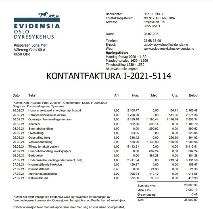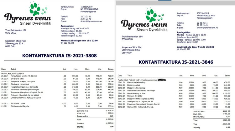 Kvitteringer fra Dyrenes Venn og Evidensia
