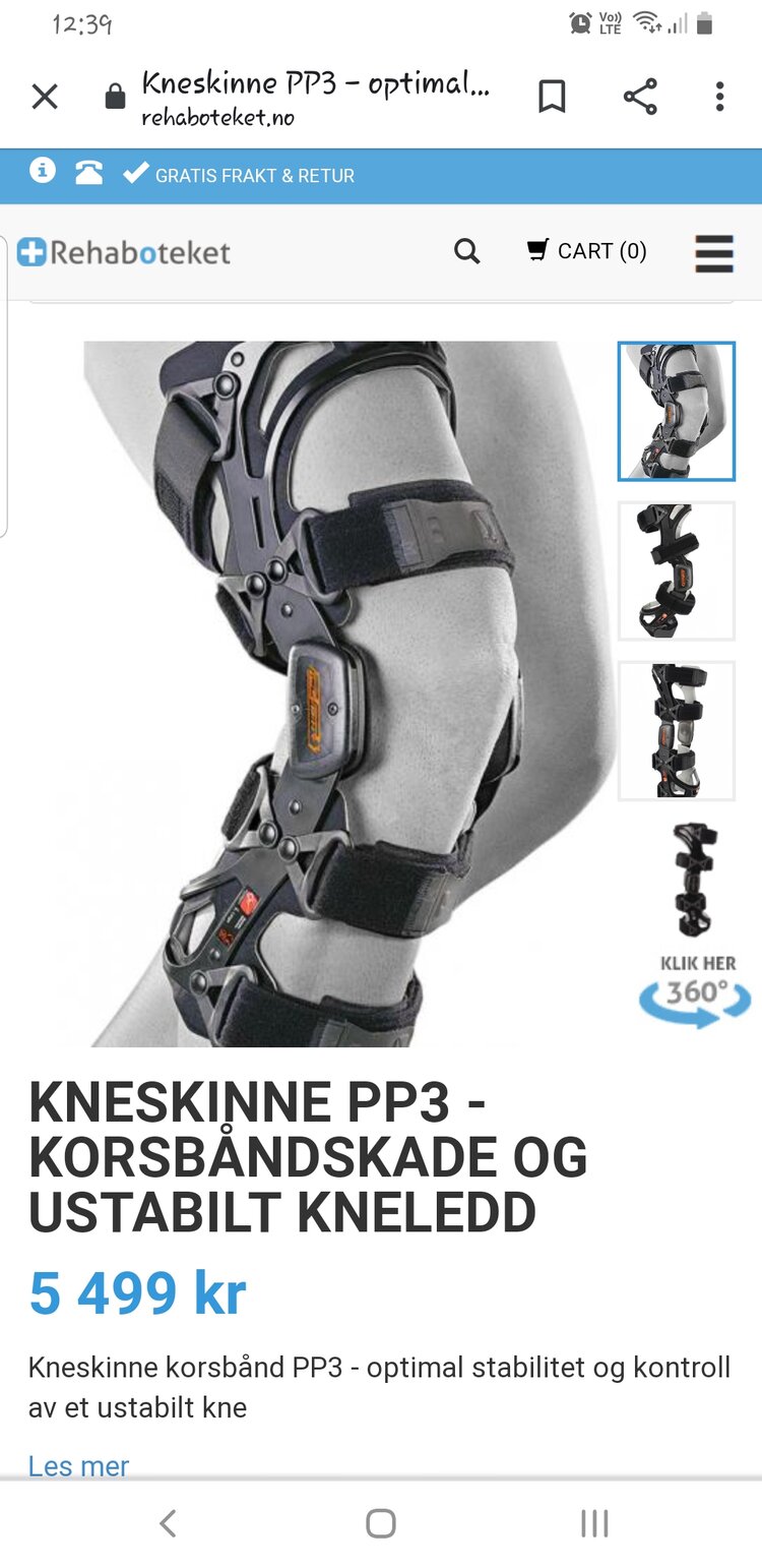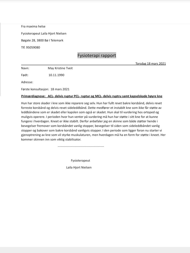 Foreløpig går eg til fysioterapeut som taper opp kneet mitt for å gi litt støtte til til beinet fram til eg får råd til å kjøpe skinne, tapen må byttes ca hver 5 dag og timen går ikke innunder helfo ordningen, eg skal over til en fysioterapeut som er innunder helfo så fort eg får skinne, men foreløpig må eg gå til ei som er spesialist på kne skader som kan tape det riktig.