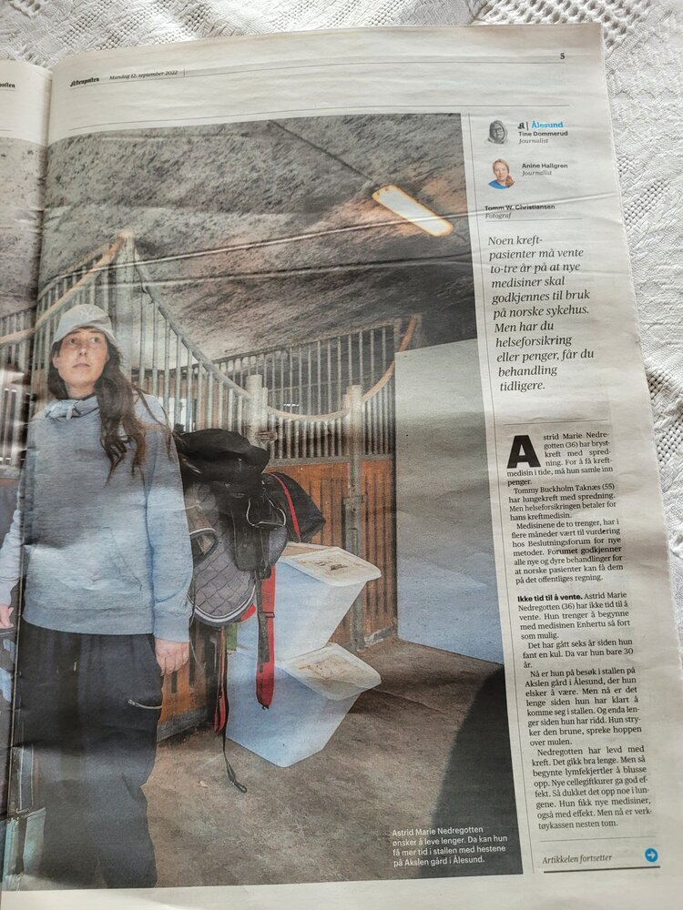 Selv om hun fikk mye tung behandling og cellegift lot hun seg ikke stoppe av det. Astrid var hestejente tvers igjennom. Hun sa alltid at "hest er livstil", og hun var fast bestemt på å fortsette å være i stallen. Selv om hun var alvorlig svekket av celletift var hun alltid tidlig oppe og i stallen for å ordne, og så igjen ved middagstider, og til kvelds. Dyrene var livet hennes og hun elsket å være i stallen. Hun kjørte til og med traktor, og det var ingen ting hun ikke fikk til når det gjalt hest.