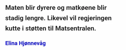 Regjeringen ønsker å kutte støtten til matsentralen med 600.000 kroner i en tid hvor fler og fler vil slite , i kombinasjon med krig i Europa vil fattighuset , blå kors m.f få mange flere munner og mette , men dette kuttet rammer hardt , og matsentralen går tom for mat . Når man ser at ubetydelige kutt i statsbudsjettet får både TV tid og voldsomt engasjement , men dette som rammer de som har minst knapt får en notis i avisen blir man bare oppgitt. Spleisen går selvsagt uavkortet til Matsentralen Oslo , minus avgift til spleis.no. støtt og del. Det er snart Jul.