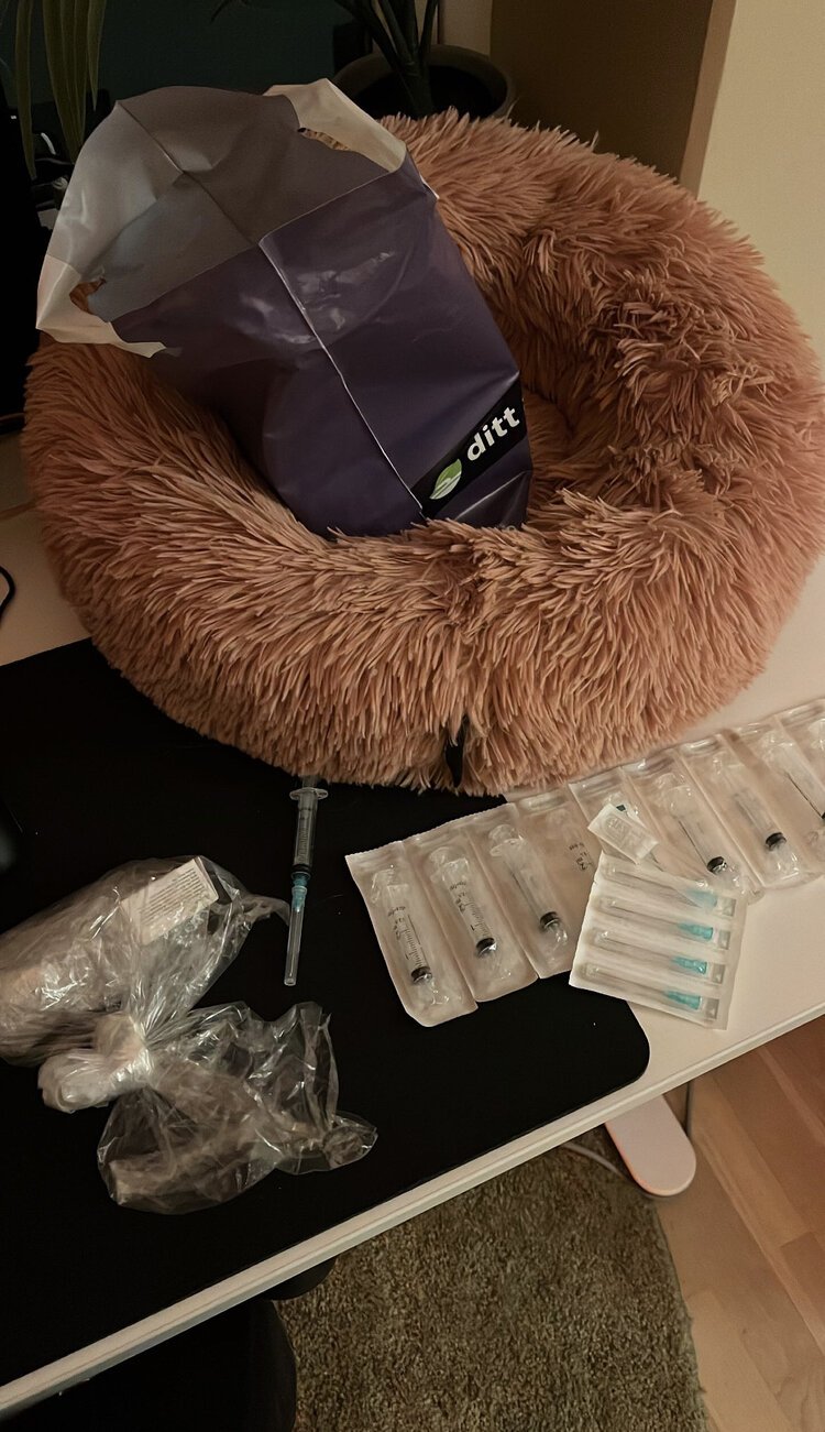 Fip is a dangerous and rare mutatation of the coronavirus for cats which has a 99% death rate. Without treatment our only choice was to watch him suffer till the end or euthanise him before that time. But with lots of help and welcoming arms we found treatment. Because the treatment is still so new and not yet researched enough it's still not registered as medicine in our country, meaning vets are not allowed to give it out to people yet. The treatment consists of one syringe shot everyday for 84days (3months), followed by 3months of checkups to see that the virus doesn't come back. (Picture below: Medicine, needles and syringes bought in for his treatment that we started 28/01/23)