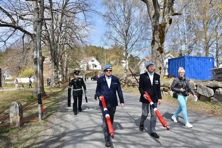 De ny-innkjøpte paradeflaggene ble levert få dager før 8. mai. Etter utpakking og en omgang med strykejernet var de klar for innsats i tidenes flaggborg i Asker. Veteranene Robert Claussen og Trond Myrvang gjorde en flott innsats som stramme flaggvoktere under seremoniene ved Hurum, Røyken og Asker kirker. Respekt! Tusen takk for alle bidrag og støtte! Mvh Roy Hovdan