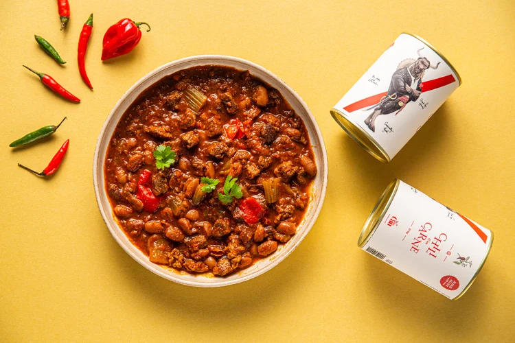 Chili Con Carne: Uansett vær og vind, står vår kraftige og lidenskapelige Chili Con Carne alltid ved din side. Basert på storfekjøtt, pintobønner, hvitløk, chili, tomat og oregano.