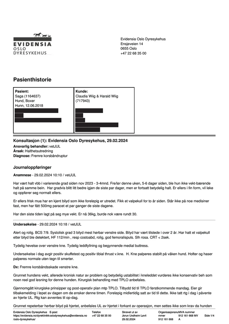 The total cost of the surgery (54.000 NOK), including pre-operative tests, the procedure itself, post-operative care, and medications, is estimated to be 75.000 NOK. Our insurance is covering only expenses up to 20.000 NOK per year. As much as we want to provide Saga with the care she needs, this financial burden is more than we can handle alone.