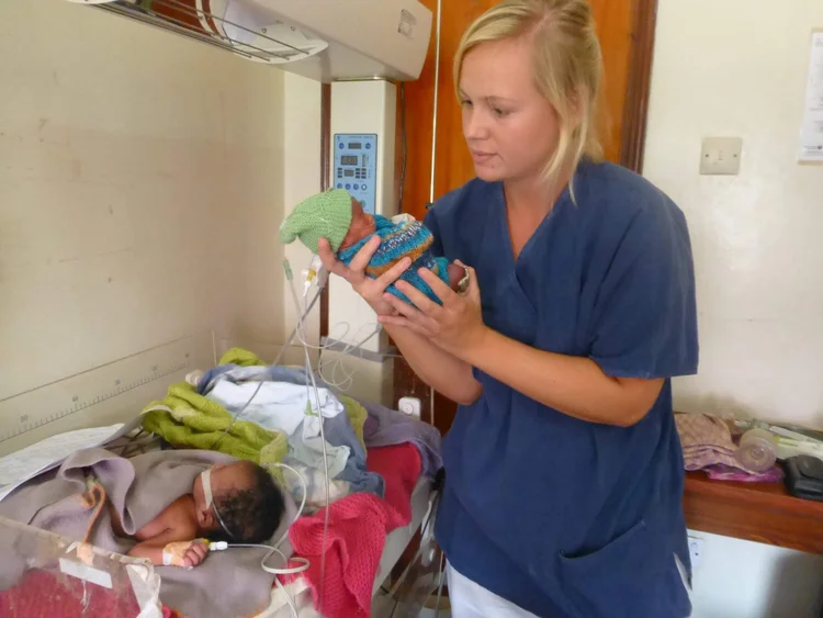 Hanne som frivillig på sykehus i Tanzania med to premature babyer.