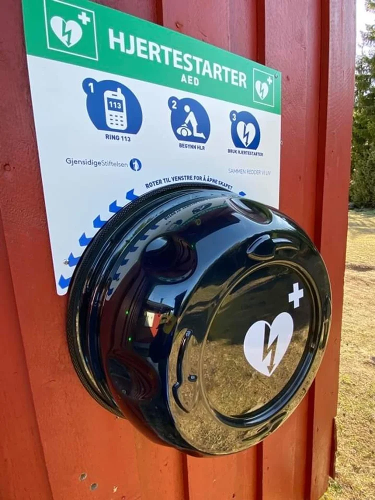 Hjertestartere plassert i varmeskap på ytterveggene på hyttene, tilgjengelig for alle.