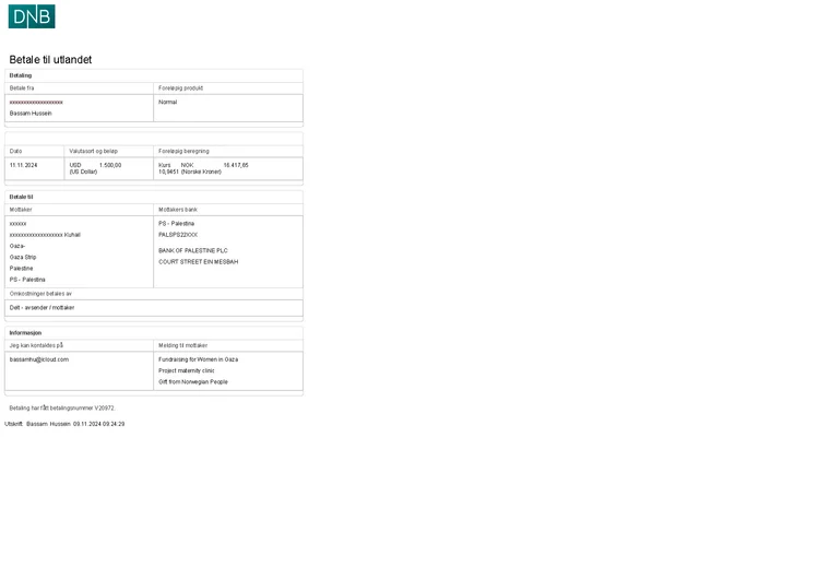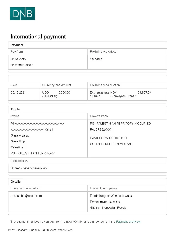 I dag har jeg overført USD 1500 (ca 16 400) til Gaza. Pengene vil bli fordelt til kvinner som har det vanskelig og som har akutt behov for hjelp. Når pengene er delt ut, vil jeg dele videoer og hilsener fra kvinnene som mottar støtten.