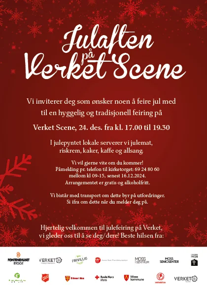 Vi gleder oss igjen til å arrangere Julaftenfeiring på Verket Scene. Her inviteres den som ønsker å feire julaften sammen med andre, til en hyggelig og tradisjonell feiring med julebuffét, julesanger og hyggelig fellesskap. Vi tilbyr også transport for den som trenger det. Arrangementet er alkoholfritt, og det er gratis for den som melder seg på. Derfor er vi takknemlig hvis du har mulighet til å bli med på en spleis!