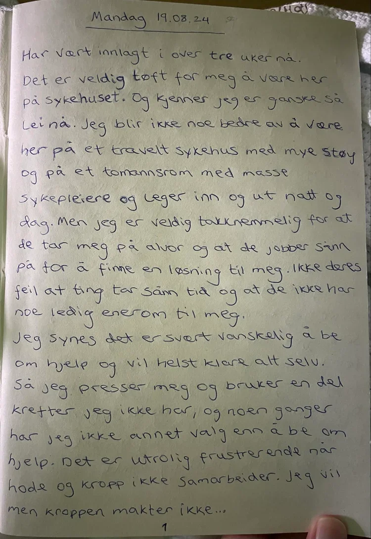 Min datter nå er innlagt på grunn av at hun er veldig syk, hjemmetjenesten ikke kunne ivareta henne ordentlig hjemme.