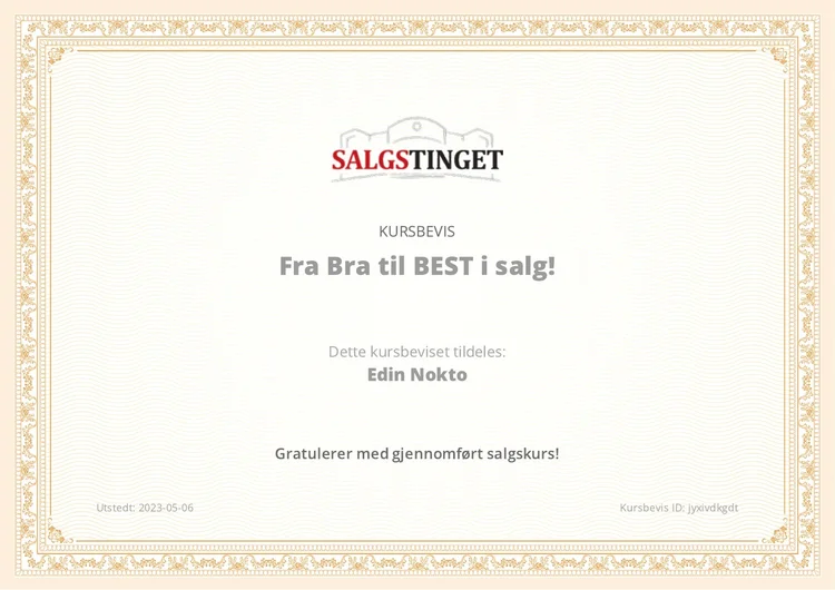 Rett etter min tid på BilXtra så gjennomførte jeg Fra Bra til BEST i salg ved Salgstinget! Det var dette kurset som ga meg motivasjon til starte og gjennomføre min egen business.