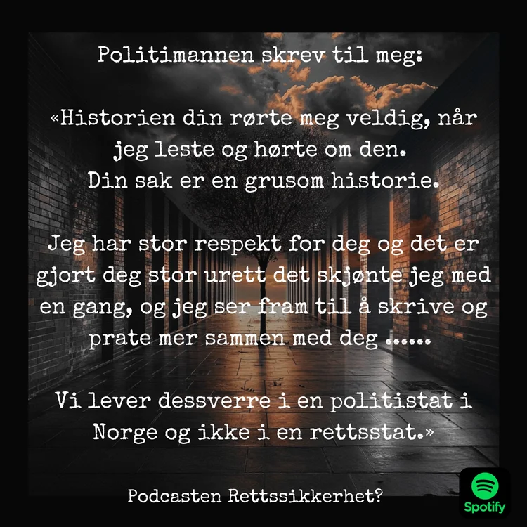 Den som tar seg tid til å lese/lytte vil kunne vite i hvilket land man faktisk bor, og vil deretter kunne ta de nødvendige forhåndsregler for å ivareta seg selv, sin bedrift og dem man elsker. Jeg synes innbyggerne i et land har rett til å vite hvor de bor, og hvorvidt politiet, påtalemyndigheten og domstolene er til å stole på.
