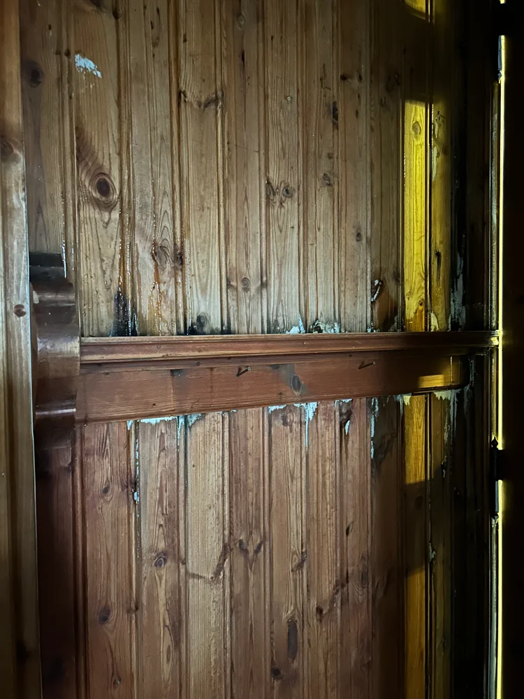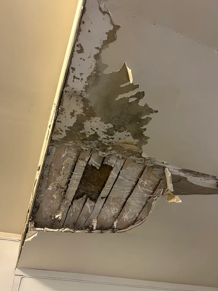 Høsten 2024 var vi så uheldige å oppdage omfattende skader innvendig på lokalet etter vanninntrengning utenfra. Skadene har oppstått fordi det ikke ble tettet godt nok rundt de to pipene på taket. Firmaet som la nytt tak i 2022 har ikke brukt riktige materialer for å tette rundt pipene og derfor har vann seget inn hver gang det har regnet, samt ved snøsmelting.
