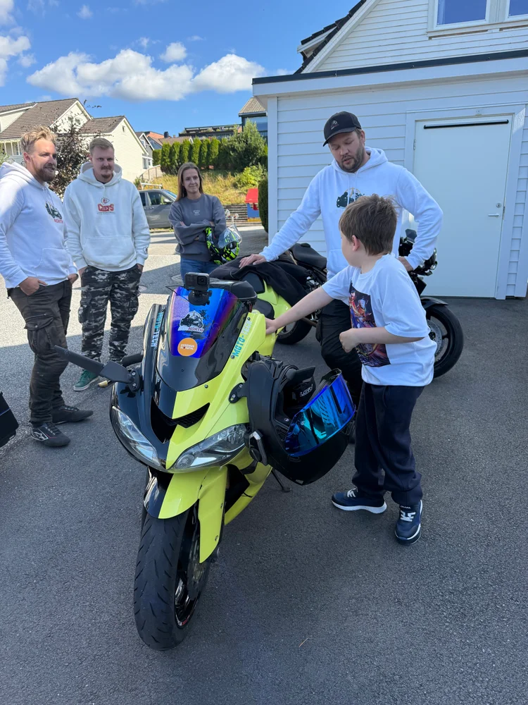 Men FastNorth-prosjektet er ikke over selv om turen er det. Midt underveis på turen fikk jeg en melding fra en mamma som satte stor pris på det vi gjør, og som delte litt om sønnen hennes, Mathias, som ofte er på sykehuset. Vi tok en prat, og da jeg kom hjem fikk vi samlet en liten gjeng motorsykler og dro på besøk til han lørdag 23. august. Sammen med Lucky Bowl fikk vi gitt han et gavekort – og den gleden vi så i øynene hans da han fikk starte motorsykler og kjenne vibrasjonene fra motorene… det var helt ubeskrivelig 🤩