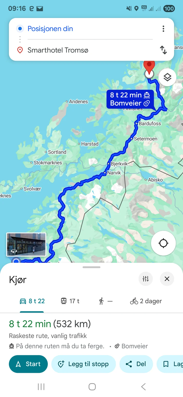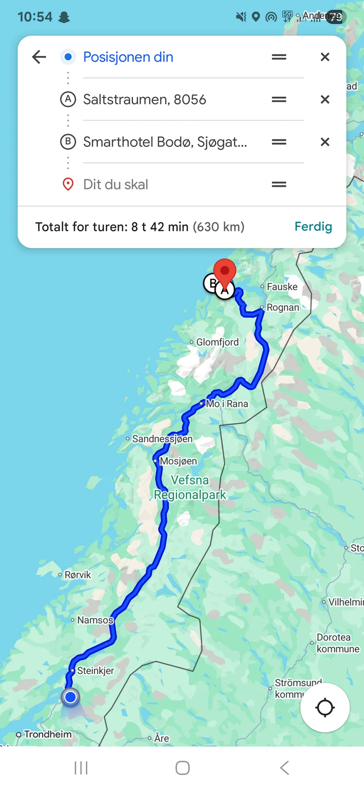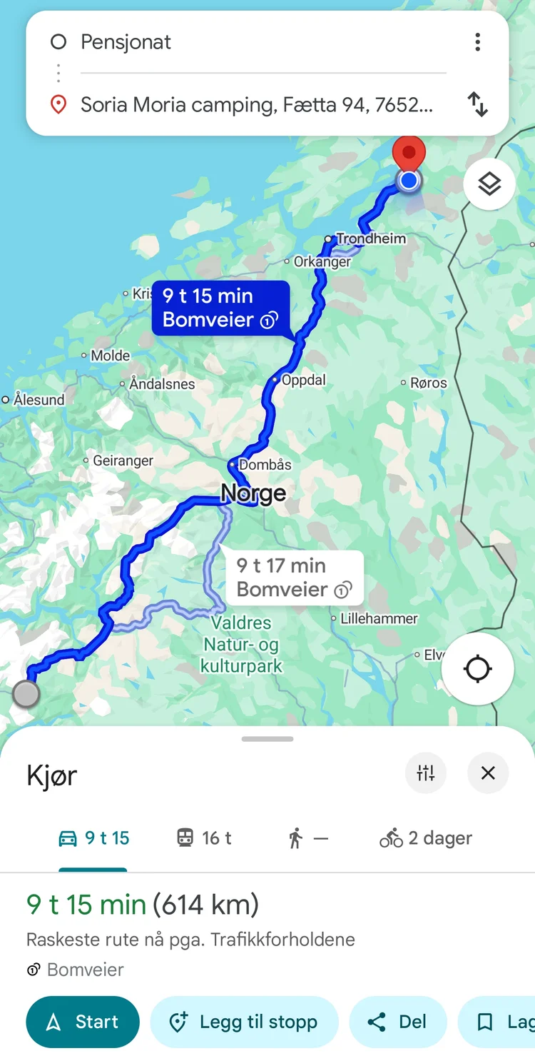 Jeg hadde også sett for meg å legge turen innom Lofoten, Atlanterhavsveien og Trollstigen på returen. Men med værmeldingene som kom – pøsregn i Lofoten, og minusgrader med sludd på Trollstigen – måtte jeg ta en realitetsjekk. Lofoten fortjener oppholdsvær, og å kjøre Trollstigen i sludd hadde nok ikke vært veldig smart… Så de planene får vente til neste gang!