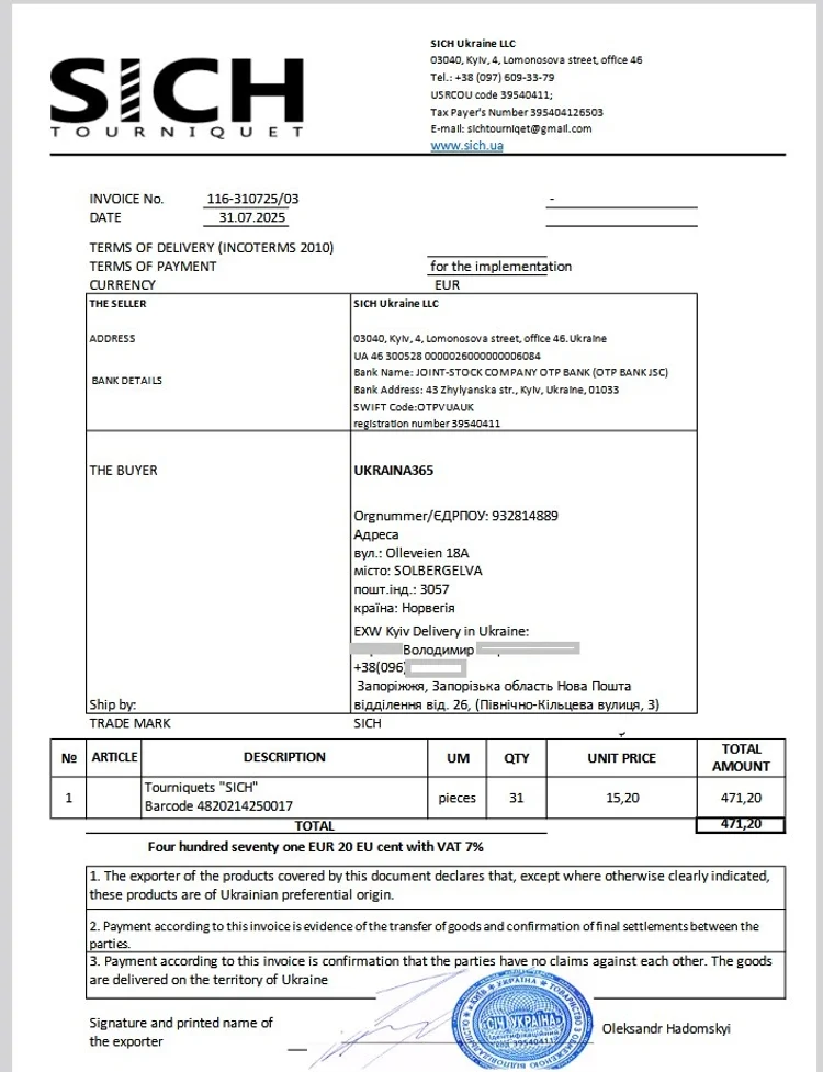 Vi kjøpte 31 tourniqueter for 471,20 EUR, og resten av beløpet gikk til gebyr vil dekke gebyrer for utenlandsk bankbetaling.