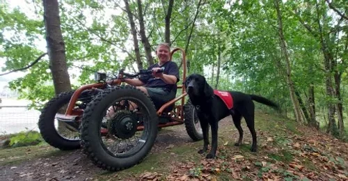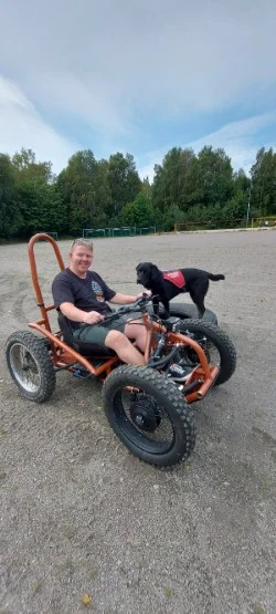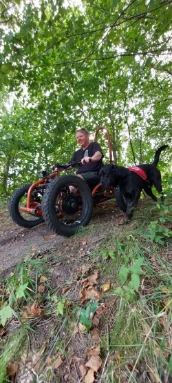 Han har bl.a. fått en elektrisk rullestol, en Permobil X850 av NAV, men den gir så mye smerter og spasmer pga. sittestillingen og at han må holde seg godt fast her vi bor for å lufte servicehunden og for å i det hele tatt komme seg frem.