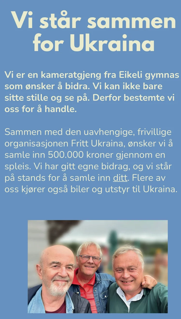 Vi er en kameratgjeng på 8 fra Eikeli gymnas som står sammen for Ukraina. Vi kan ikke sitte stille og se på angrepskrigen fra Russland i Ukraina. Vi bestemte oss for å handle.
