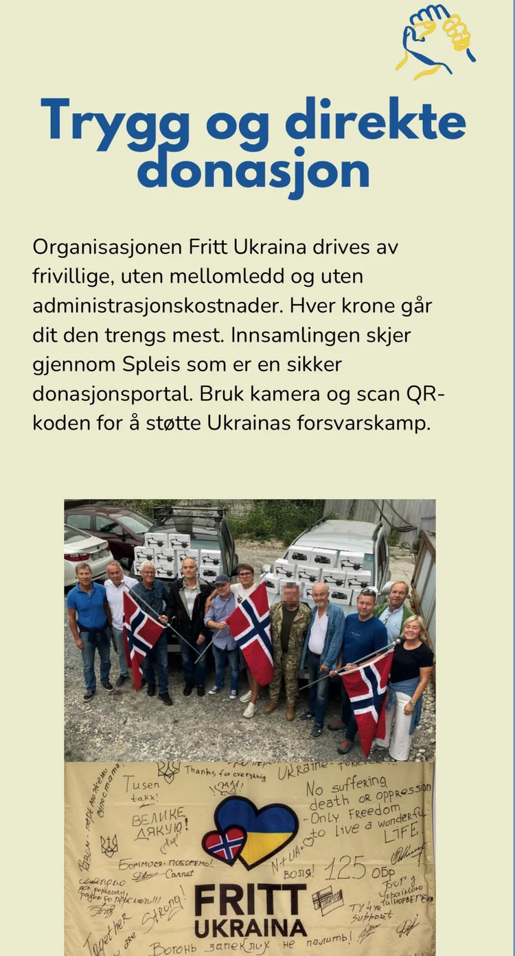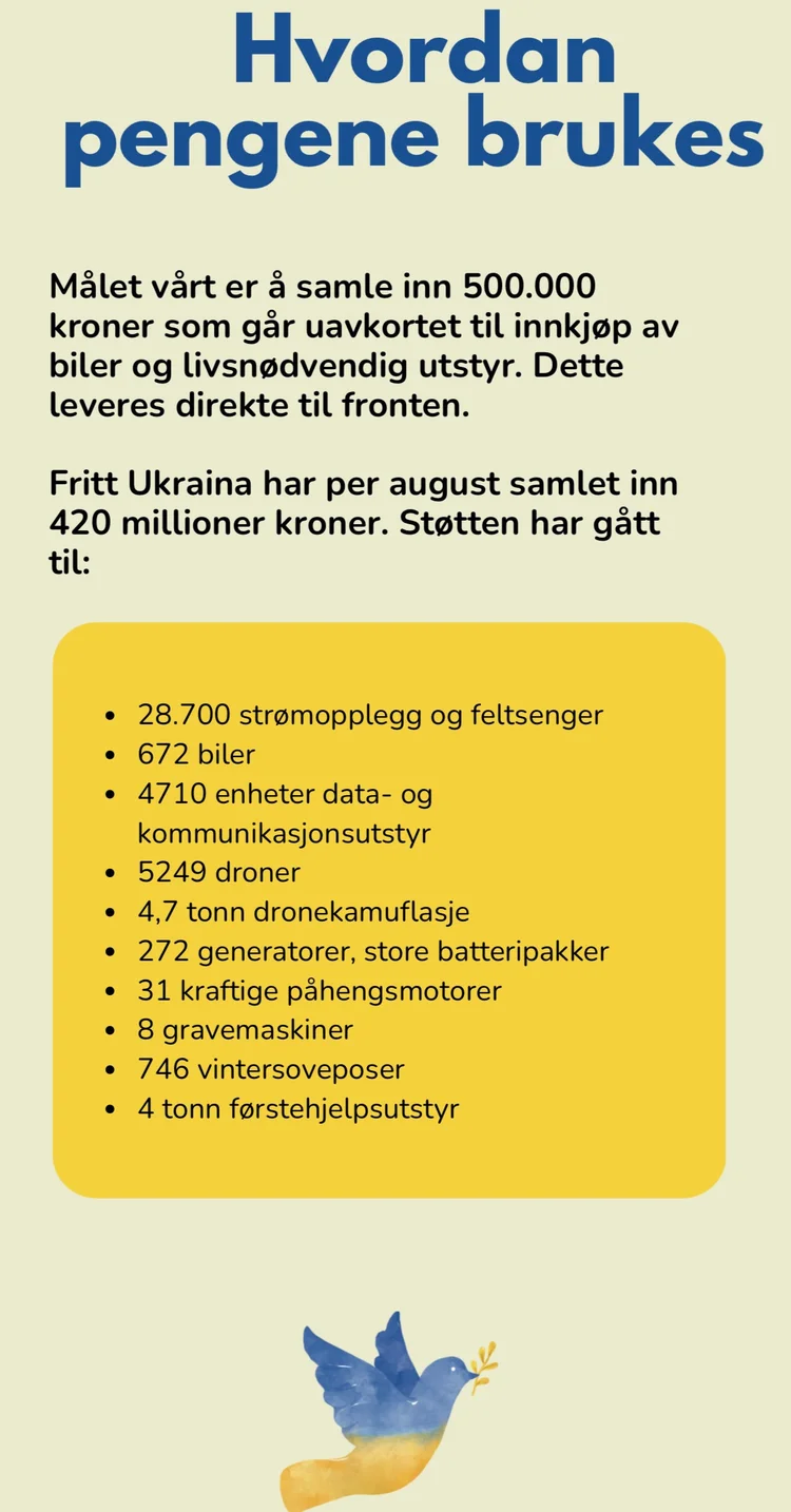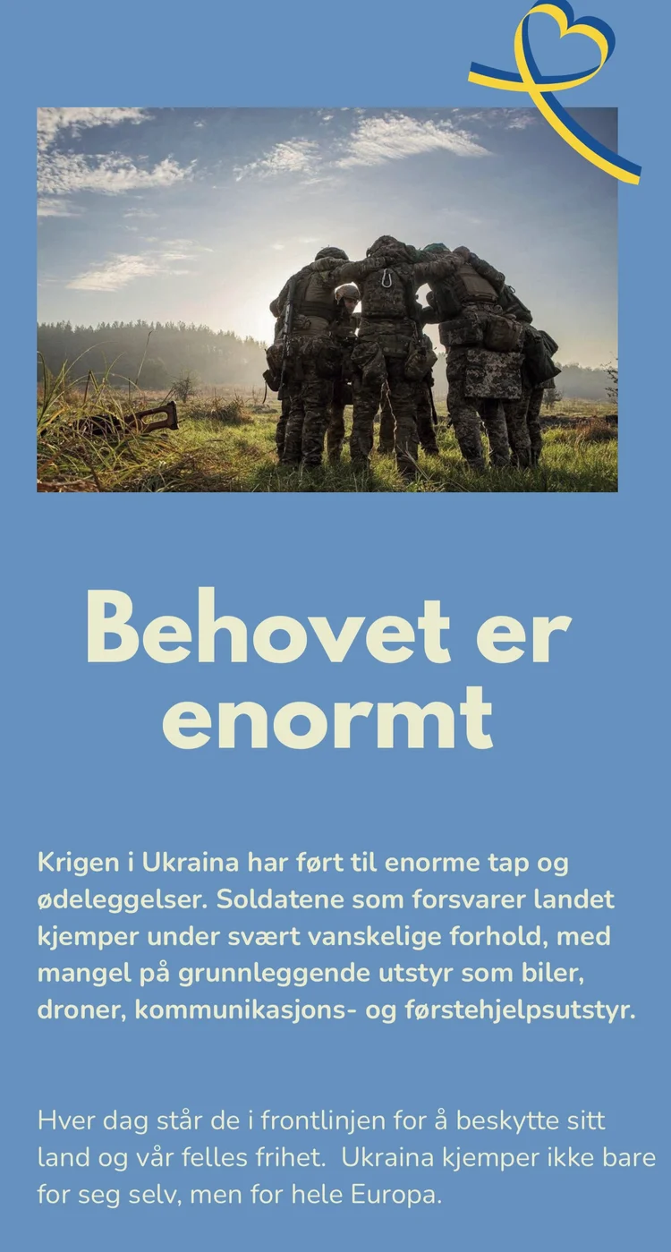 Krigen i Ukraina har ført til enorme tap av liv, store ødeleggelser og lidelser. Sammen med den uavhengige, frivillige organisasjonen Fritt Ukraina, ønsker vi å samle inn 500.000 kroner til innkjøp av biler og livsnødvendig utstyr, som leveres direkte til soldatene ved fronten. Fritt Ukraina har gjennom tre år etablert en sikker leveransemodell for utstyr til soldatene. De har innen utgangen av august 2025 levert nødvendig utstyr for 420 millioner kroner.