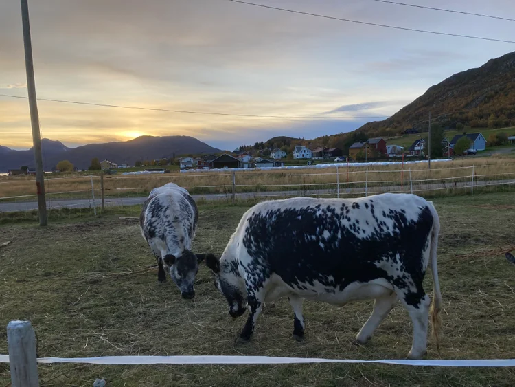 Kyr og geiter har flyttet fra beitet til vinterpaddocken sin. Deilig å ha muligheten for tak over hodet og en tørr plass å ligge når kulingen rusker og regnbygene (pluss en og annen haggelskur) kan komme rekende inn fra havet på et øyeblikks varsel. Kanskje har de et drivhusfjøs å søke ly i til neste år, men enn så lenge fungere rundbuehallen vi bygde i fjor helt utmerket. Å måtte vente på å få maten servert av folk, heller enn å finne den selv er bare sånn passe. Men, det ble en god slått i år,så vi får håpe høyet er verdt å vente på.