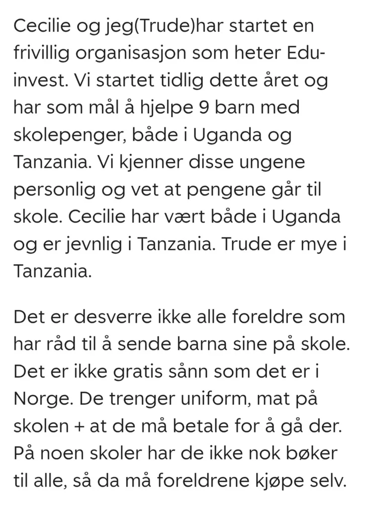 Alle pengene som samles inn går til skolepenger for 9 barn i Uganda og Tanzania.