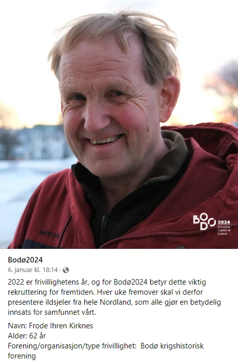 Frode Kirknes er en aktiv person som er med i både Krigshistorisk forening Bodø og Bodø Bunkermuseum. Han er svært opptatt av miljøet og at vi tar vare på det vi har rundt oss. En av Frode sine hobbyer er å rydde i naturen og nærområdet, særlig på plasser som vi andre kanskje ser det vanskelig å komme til på en enkel måte. Det kan være alt fra krigshistoriske objekter til skog, mark og strand. Frode ser ikke mørkt på noe og finner han en plass hvor det ligger ting som har det bedre på miljøtorget så tar han det med dit, uten å nøle. Vi kan nevne at Frode tidligere har fått utdelt miljøklypa for god innsats og han har vært nominert til frivillighetsprisen i Bodø.