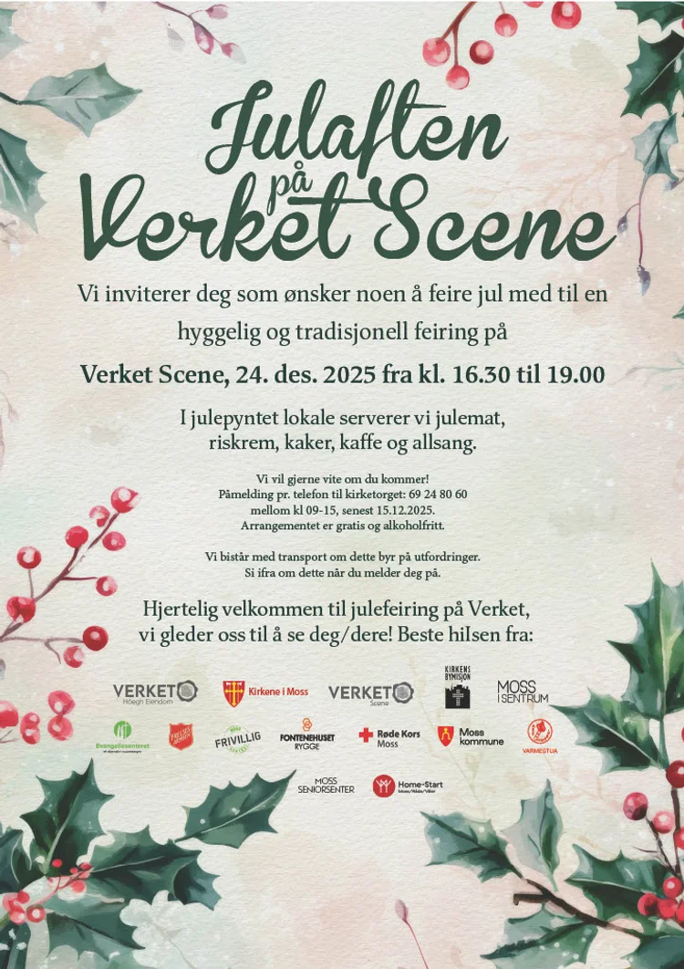 Vi gleder oss igjen til å arrangere Julaftenfeiring på Verket Scene. Her inviteres den som ønsker å feire julaften sammen med andre, til en hyggelig og tradisjonell feiring med julebuffét, julesanger og hyggelig fellesskap. Vi tilbyr også transport for den som trenger det. Arrangementet er alkoholfritt, og det er gratis for den som melder seg på. Derfor er vi takknemlig hvis du har mulighet til å bli med på en spleis!
