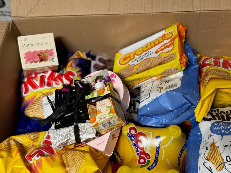 Pakkene inneholder alt man trenger til en fin feiring: Kakemiks og -pynt, brus, litt snacks og godteri – og en liten gave å glede seg over.