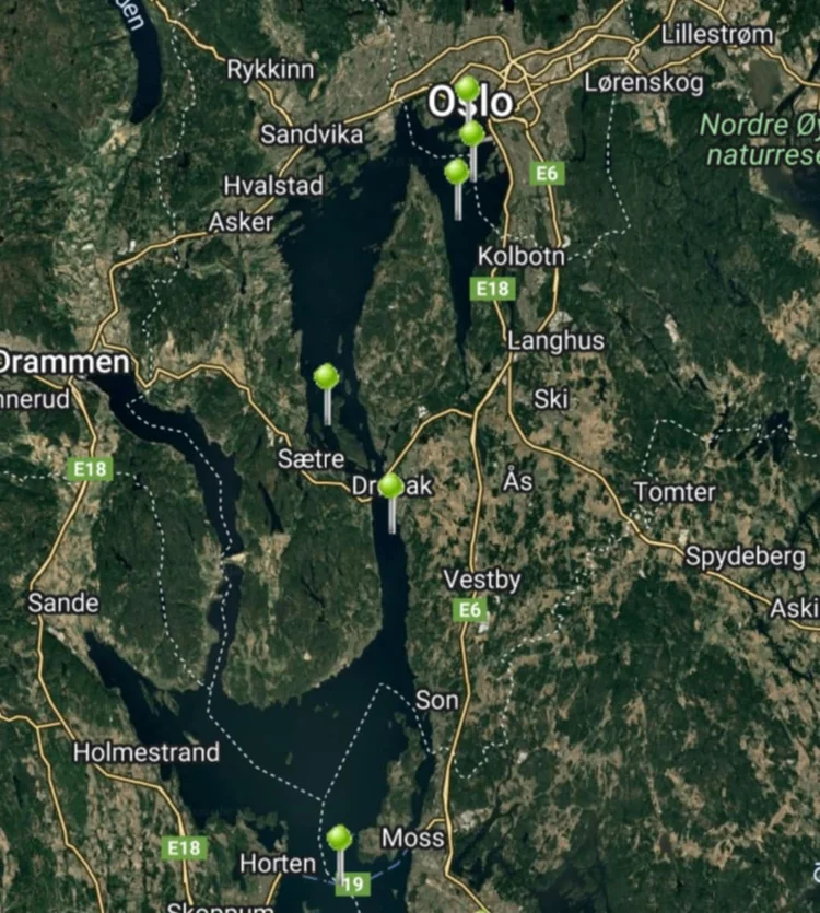 Bilde: Her ser vi seks lomviers posisjon, tre er ved Oslo enda, og tre er på vei ut fjorden.