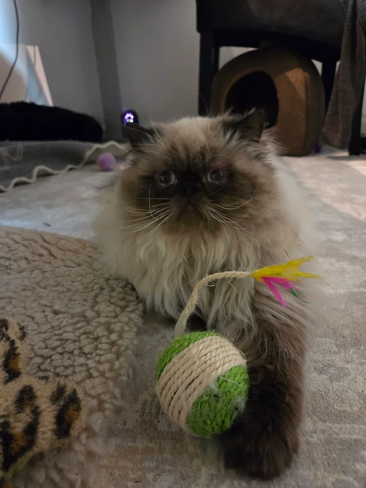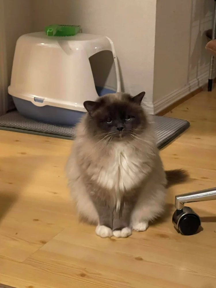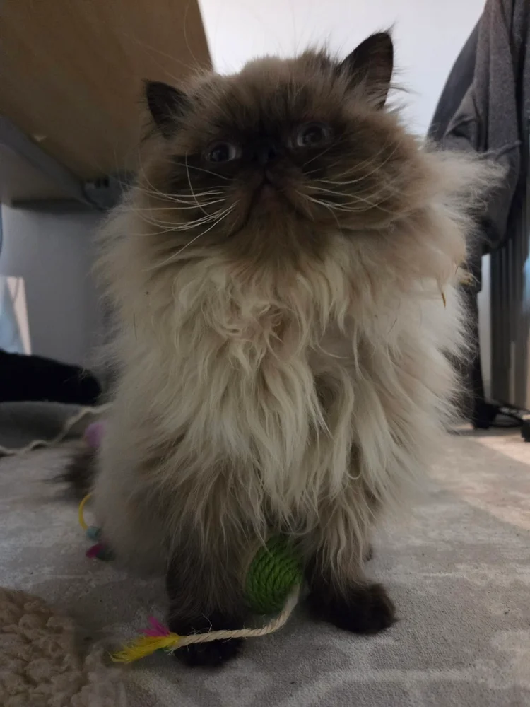 Han er en skikkelig kosegutt som ønsker seg en familie, gjerne et sted hvor han kan ha en kattekompis - han er litt forsiktig men bor sammen med en pus nå som han trives veldig godt med. Ny eier må være forberedt på at det blir en del pelsstell.
