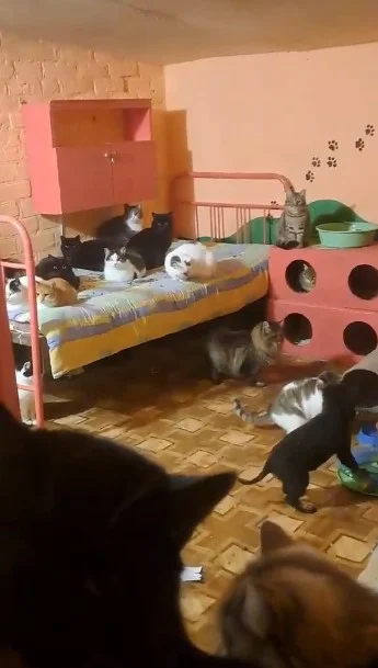 Nå befinner de seg i en desperat situasjon. Med ca. 80 katter og noen hunder i flokken er det vanskelig å finne vanlige nødboliger. De håper på et lite hus på bygda i tryggere fylker med loåven/garasjene som kan gjøres om til dyrehotel. De trenger et sted med inngjerdet uteplass og tak over hodet hvor de kan fortsette å gi dyrene omsorg mens de prøver å stable livene sine på beina igjen. Dette er noe vi ønsker å hjelpe dem med.