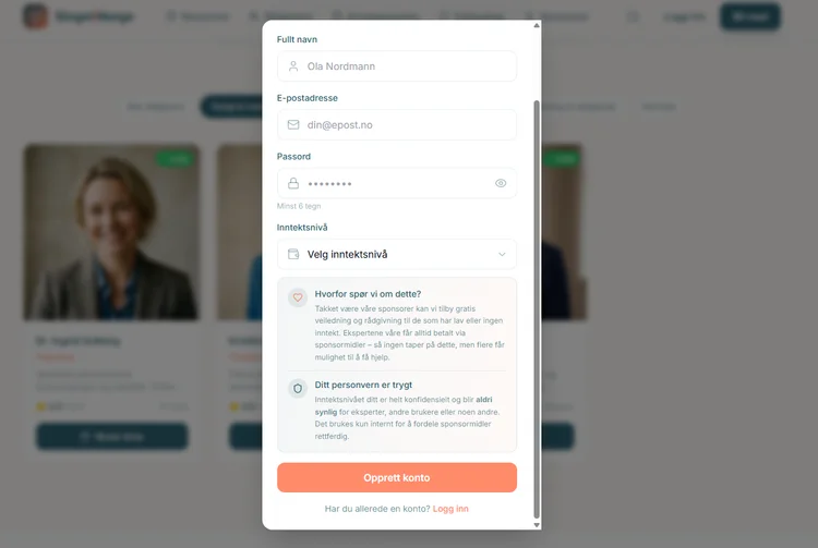 Ett spørsmål vi fikk vedrørende pris og om det ville være en ordning for de uten god råd, fikk oss til å endre registreringen til å inneholde inntektsnivå. Dette ikke bare for å kunne få en oversikt over hvilke medlemmer som skal få bruke siden gratis, men også for å kanskje gi en rask forståelse for at de som har lav eller ingen inntekt blir substidiert av våre sponsorer.