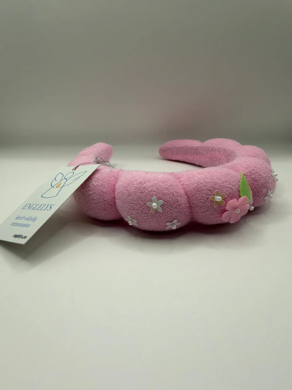 Mykt rosa hårbånd med fine blomsterdetaljer. Du kan velge denne belønningen som takk for ditt bidrag til innsamlingen for barna ❤️