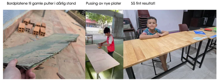 Men vi er ikke redde for å gå i gang! Pultene har blitt skrudd fra hverandre, rusten pusset ned, metallet malt på nytt, nye bordplater satt på, pusset og oljet. Her brukes alt som kan resirkuleres, på nytt!