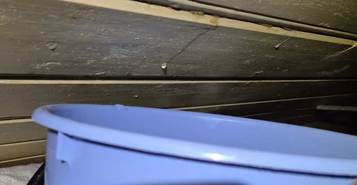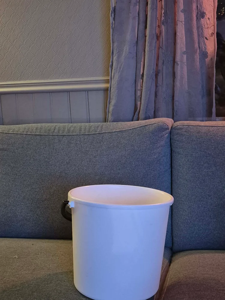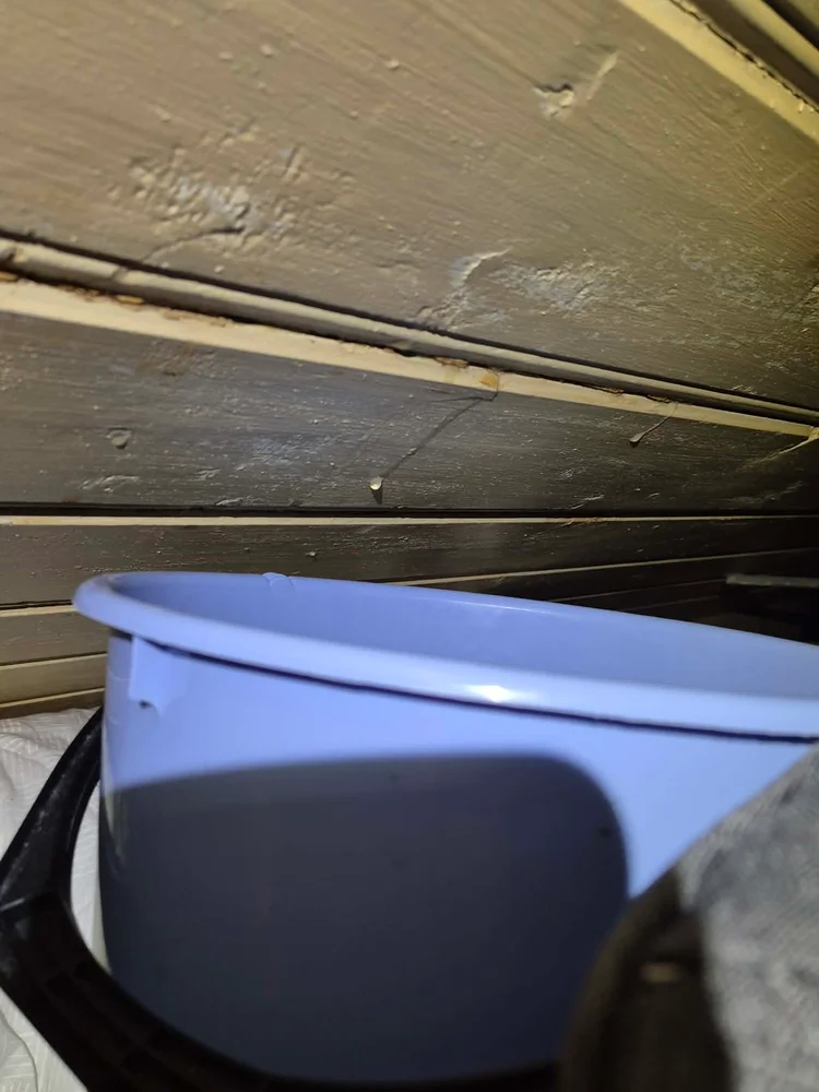 Stedet der de bor er kjent for vær, og når det først setter i gang, blir det fort alvor. De prøver så godt de kan å håndtere det med bøtter og midlertidige løsninger, men dette er ikke noe som kan vente - taket må repareres raskt for å hindre større skader.