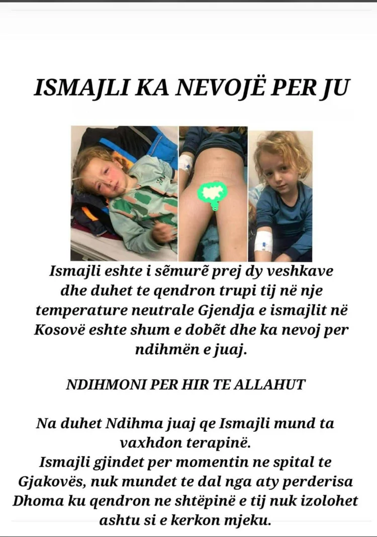 Ismajli er en gutt på 5 år og Begge nyrene til Ismajli har begynt å svikte, og kroppen hans er avhengig av å opprettholde en stabil og nøytral temperatur. Helsetilstanden hans i Kosovo er svært alvorlig, og han er i akutt behov for hjelp.