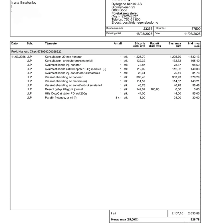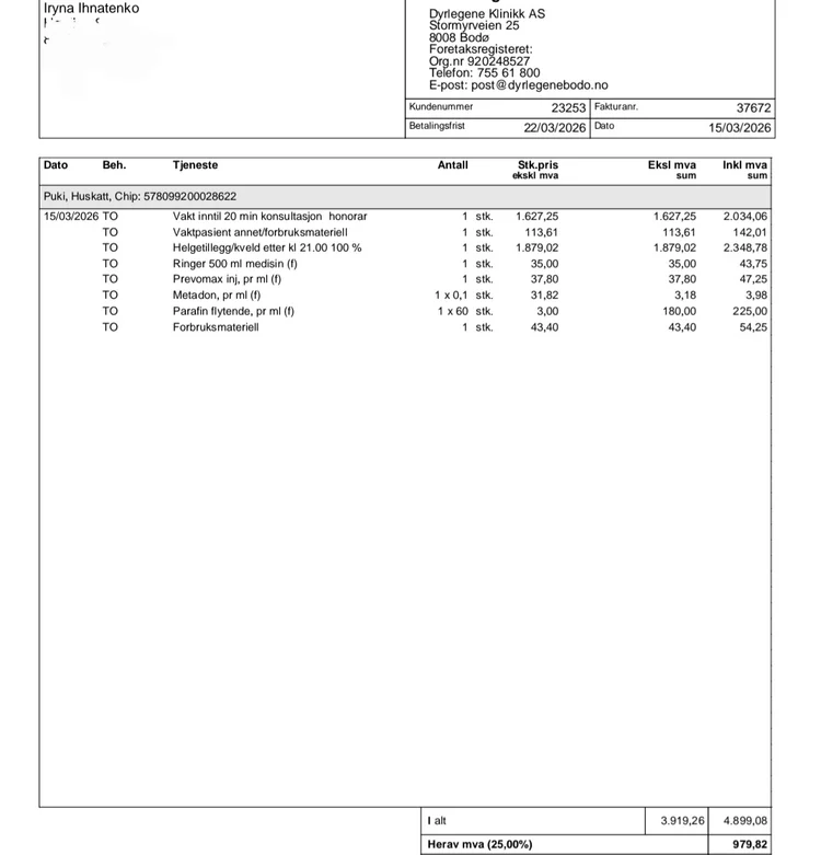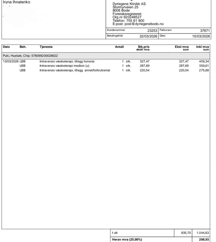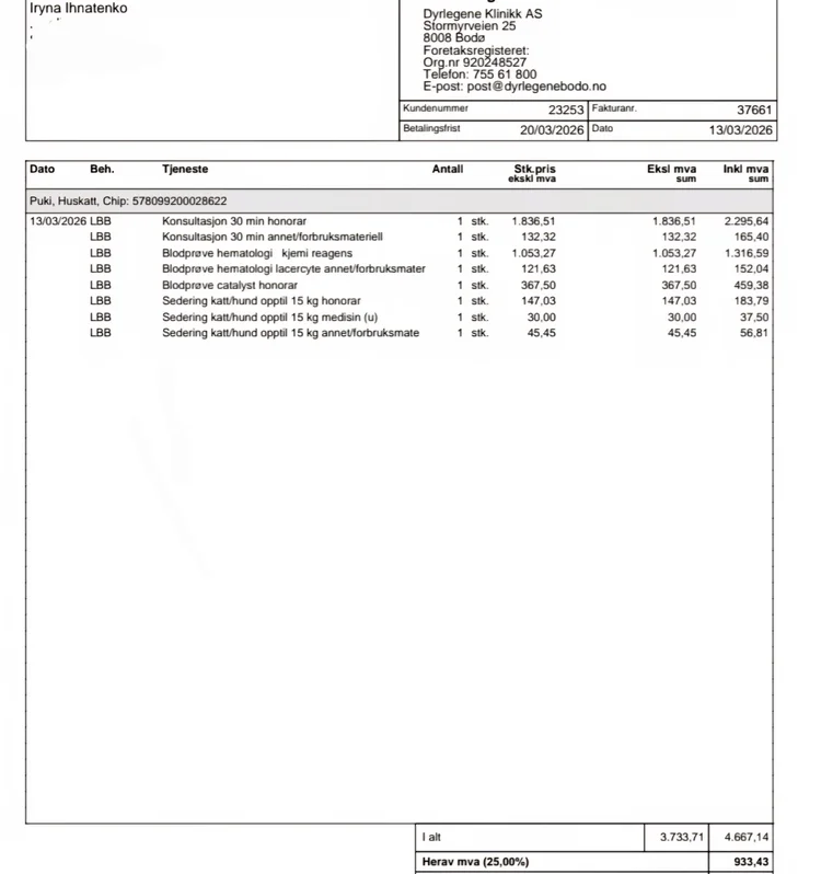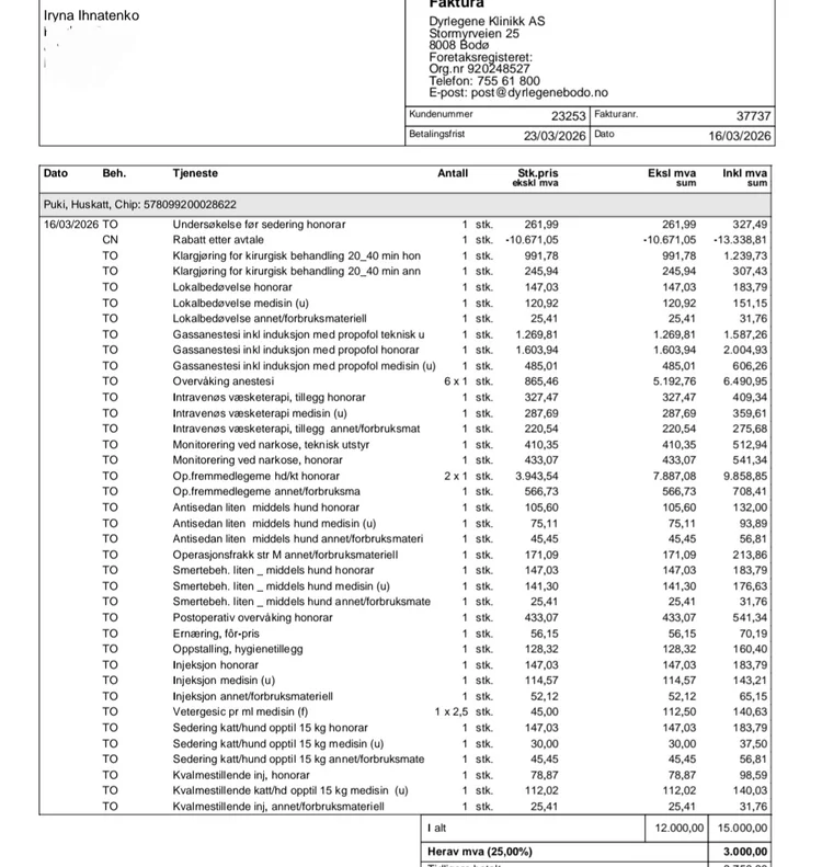 Her er dokumentasjon fra veterinær. Totalkostnaden er ca. 30 000 kr. En del er betalt med kredittkort, resten gjenstår.