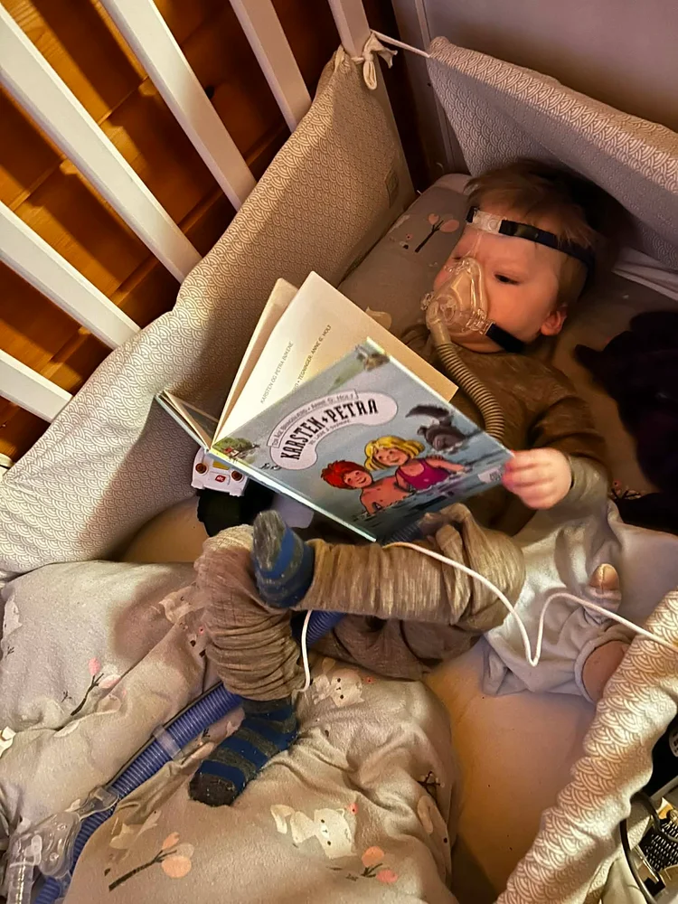 Heldigvis er hytta til Mikkel sin onkel og tante nærmeste nabo, og der kan vi låne strøm fra deres 230V-anlegg og aggregat, så Mikkel får det han trenger til respiratoren sin. Bessmor og bessfar bor i annekset. Sammen skal vi få til både nattevaktene og det å kose oss som en familie, slik vi gjorde før alt ble snudd på hodet.
