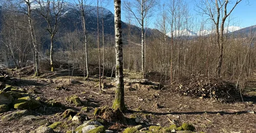 I vinter har vi tatt ned en del småtrær og busker som vi planlegger å flise opp. Flisen skla brukes til å forbedre stien opp til marka, der det trengs.