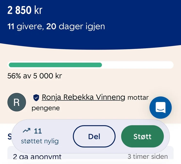 2 850 kr samlet inn på 2 dager. Klarer vi nå 3000 kr før midnatt? 🤞