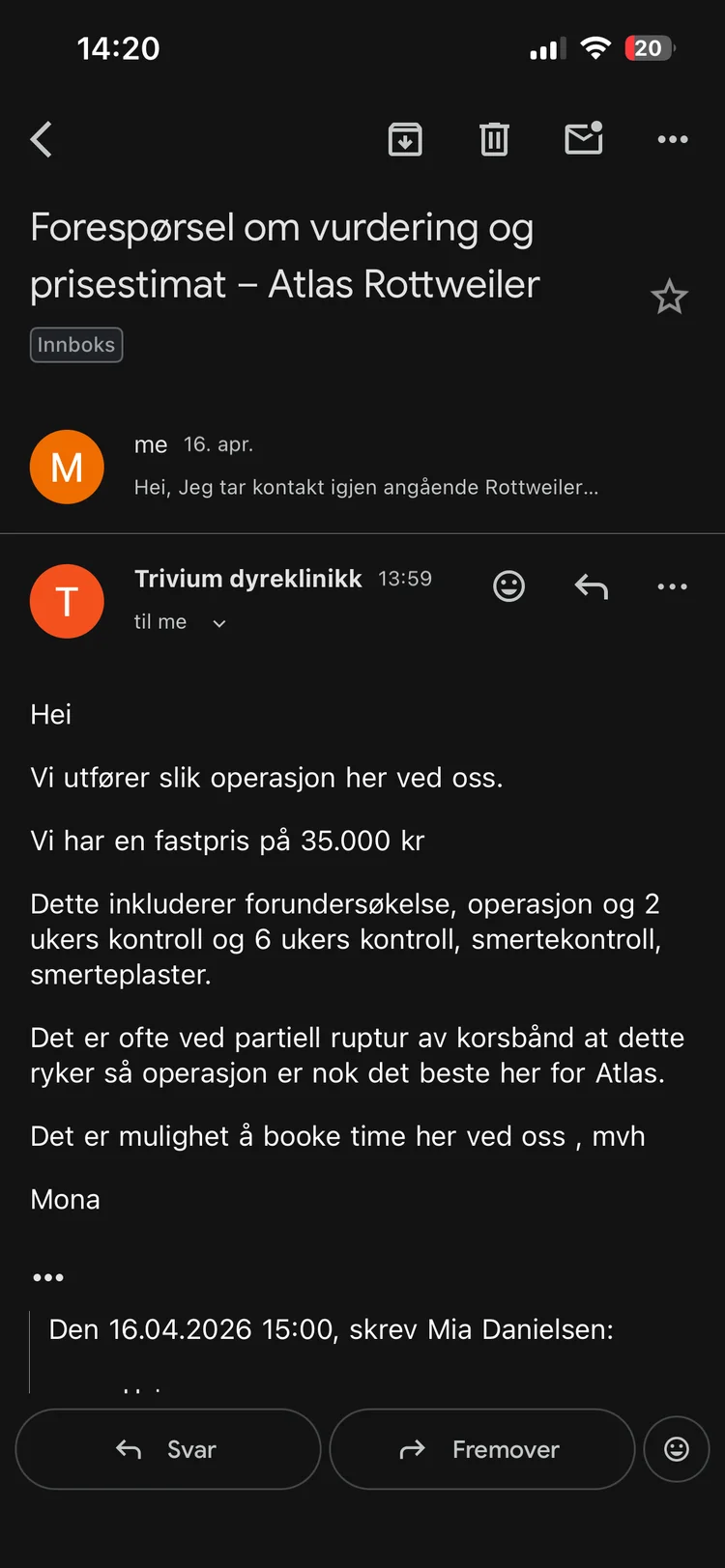 Jeg legger ved bilder av verdens herligste gutt, dokumentasjon på kostnader for tilrettelegging og mailen fra veterinær Mona på Trivium dyreklinikk🙏♥️